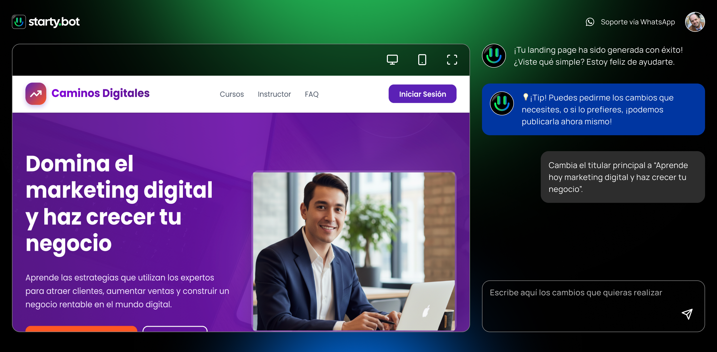 Soy starty.bot, tu agente aliado que crea tu presencia digital en minutos.